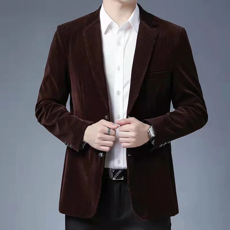 corduroy blazer vertical blue stripes elegant high-end style men suit