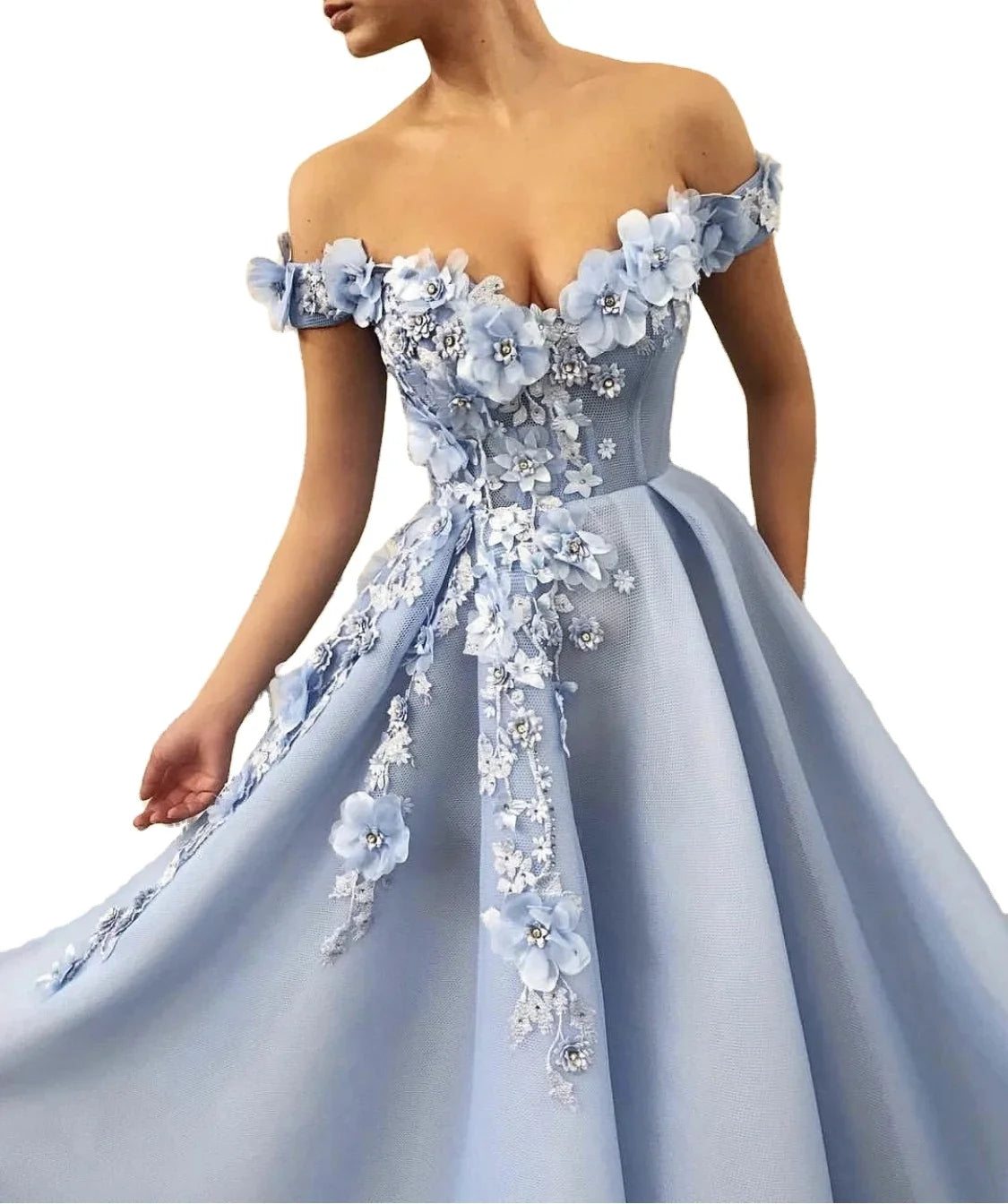 - Stunning Design: This Elegant Sky Blue Prom Dresses features a beautiful 3D flower pattern, giving it a unique and eye-catching look that is perfect for a formal evening party. The off-the-shoulder design and A-line silhouette create a feminine and romantic touch.