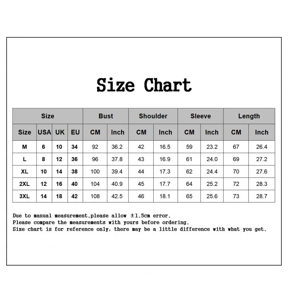 Size: 3XL, Bust: 108cm/42.5", Length: 73cm/28.7", Shoulder: 46cm/18.1", Sleeve: 65cm/25.6" (Approx.)