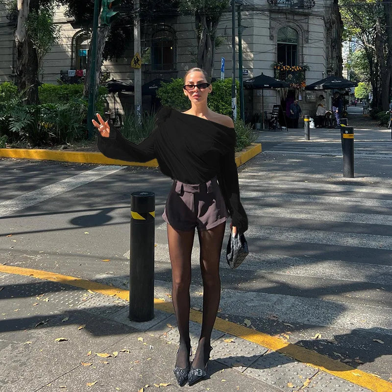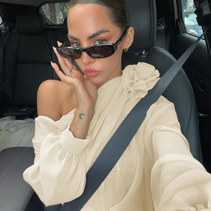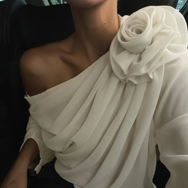 Schoensten Boutique 3D Flower Decor Chiffon Blouses and Shirts for Women Long Puff Sleeve Folding