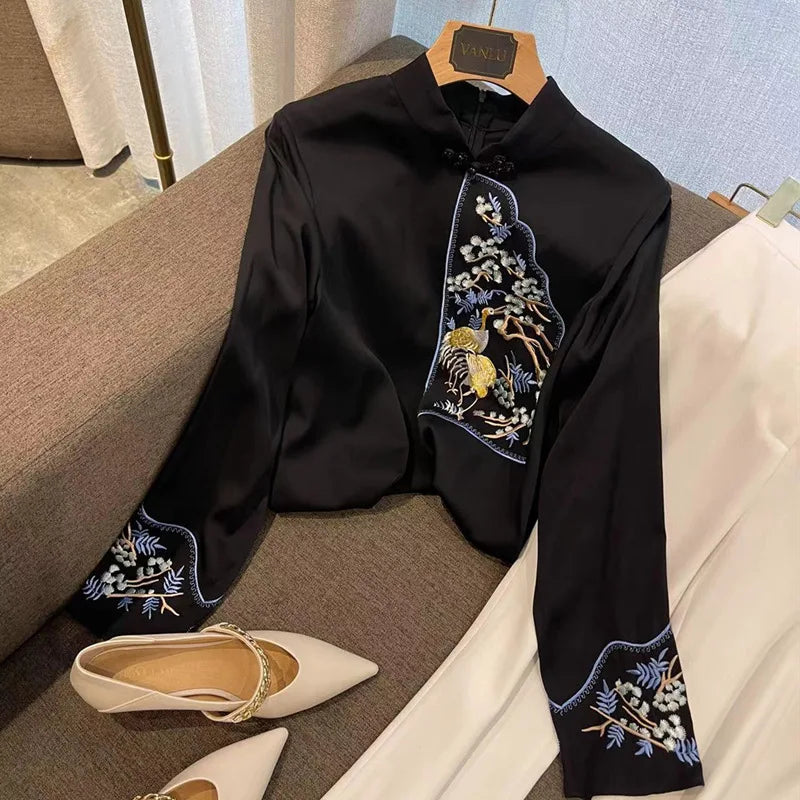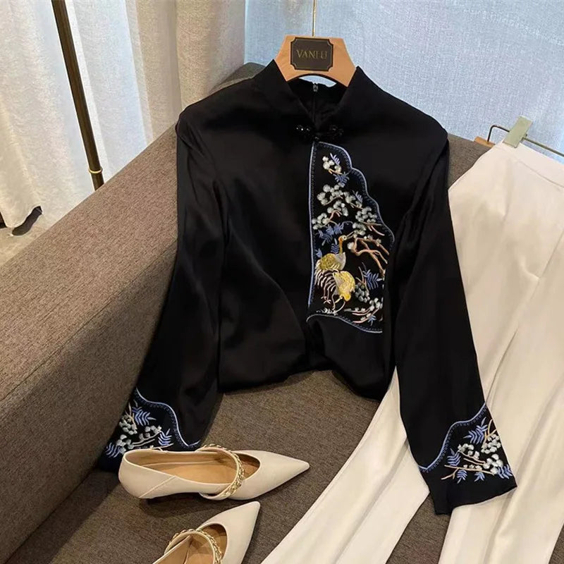 Schoensten Boutique Cloud Cranes Plate Button Embroidery Flared Sleeve Standing Collar Faux Silk Top