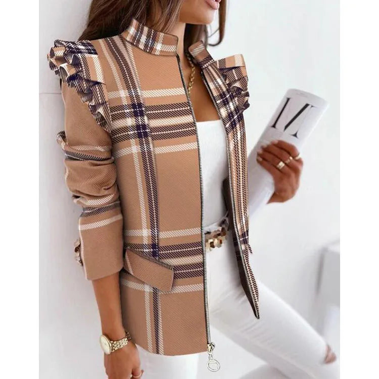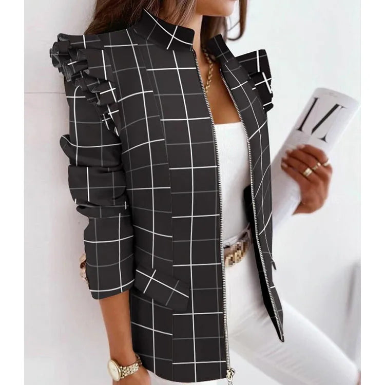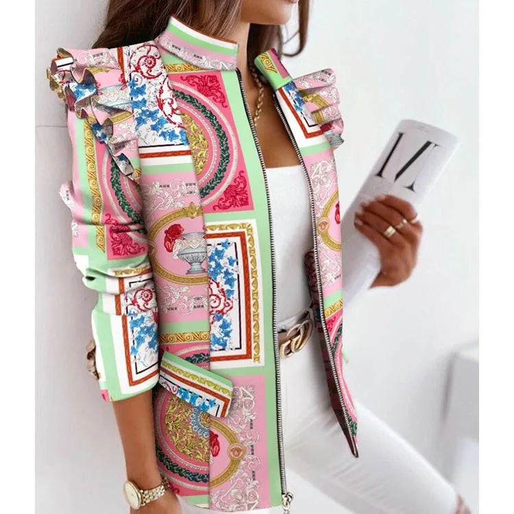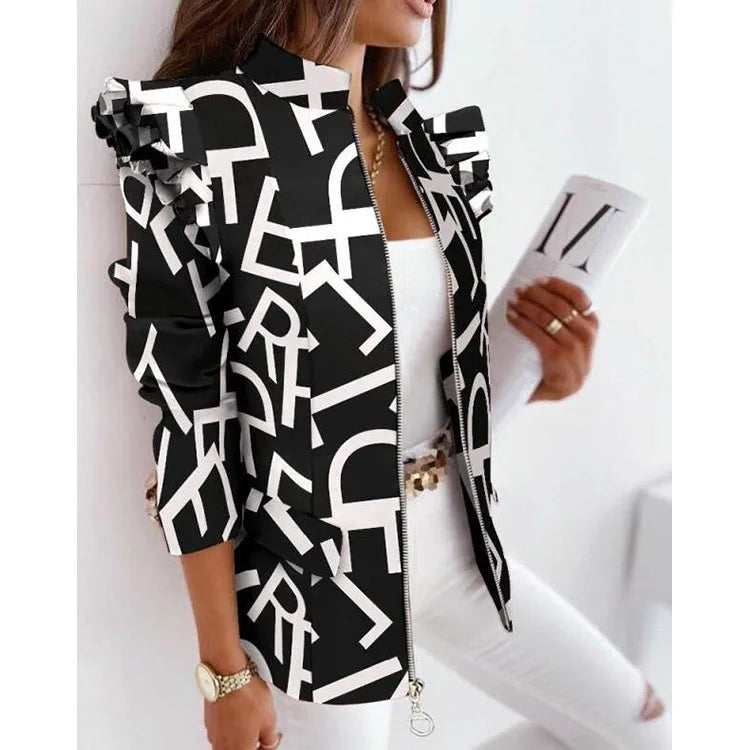 Schoensten Boutique Leopard Printed Ruffled Long-sleeved Zipper for Women Blazers