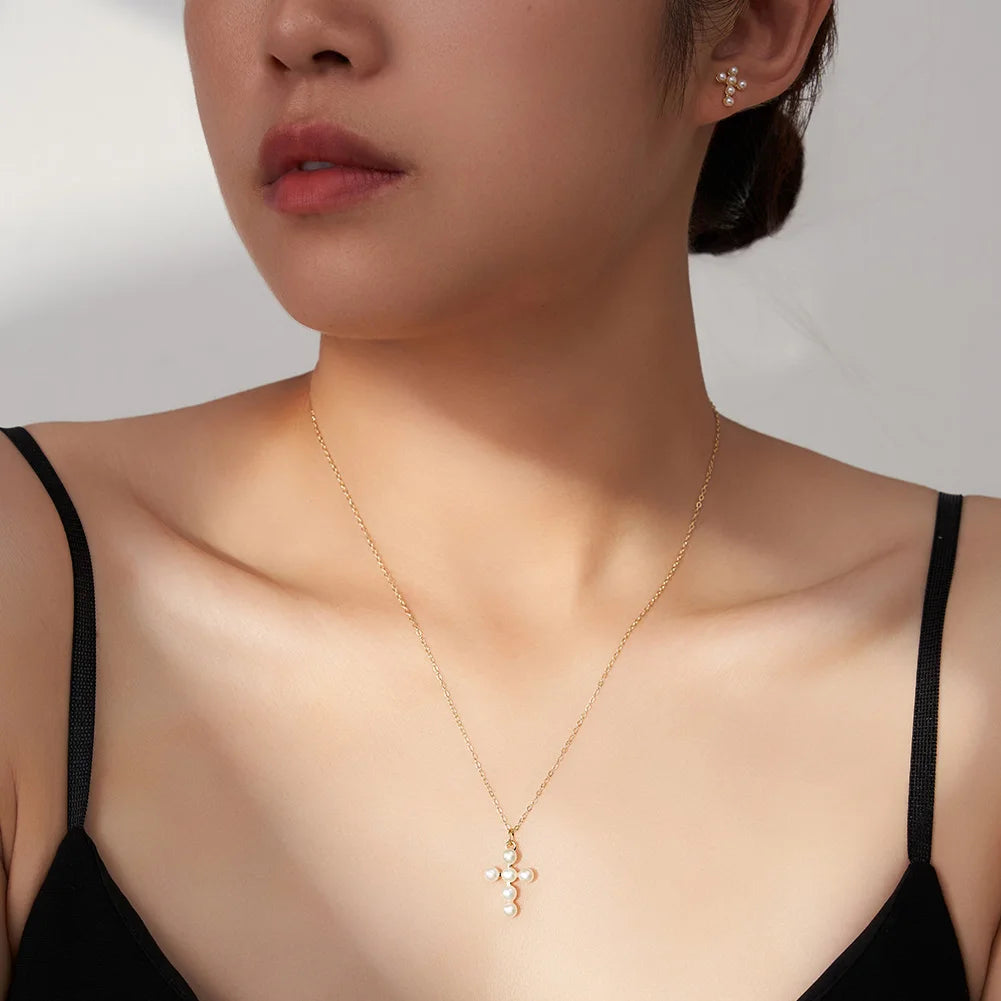 Schoensten Boutique Non Tarnish Silver Cross Women Freshwater Pearl Necklace and Earrings Set