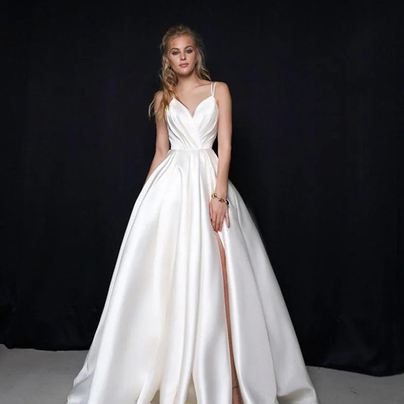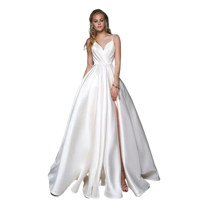 Schoensten Boutique Pleated Line Simple Satin Bridal V-neck Banquet Long Wedding Dress