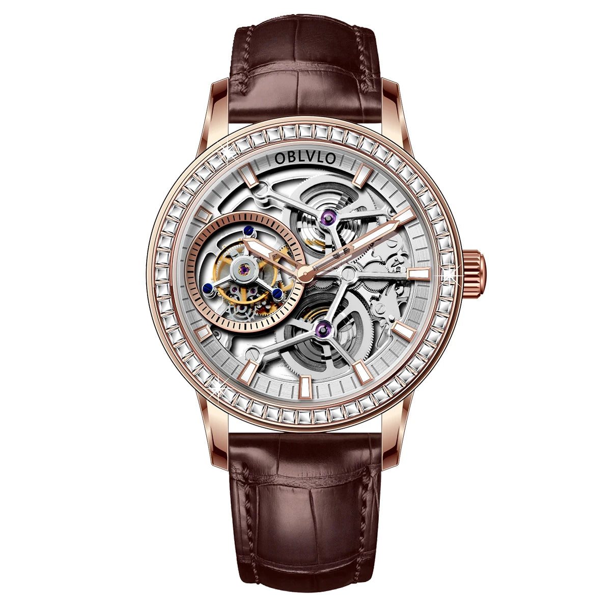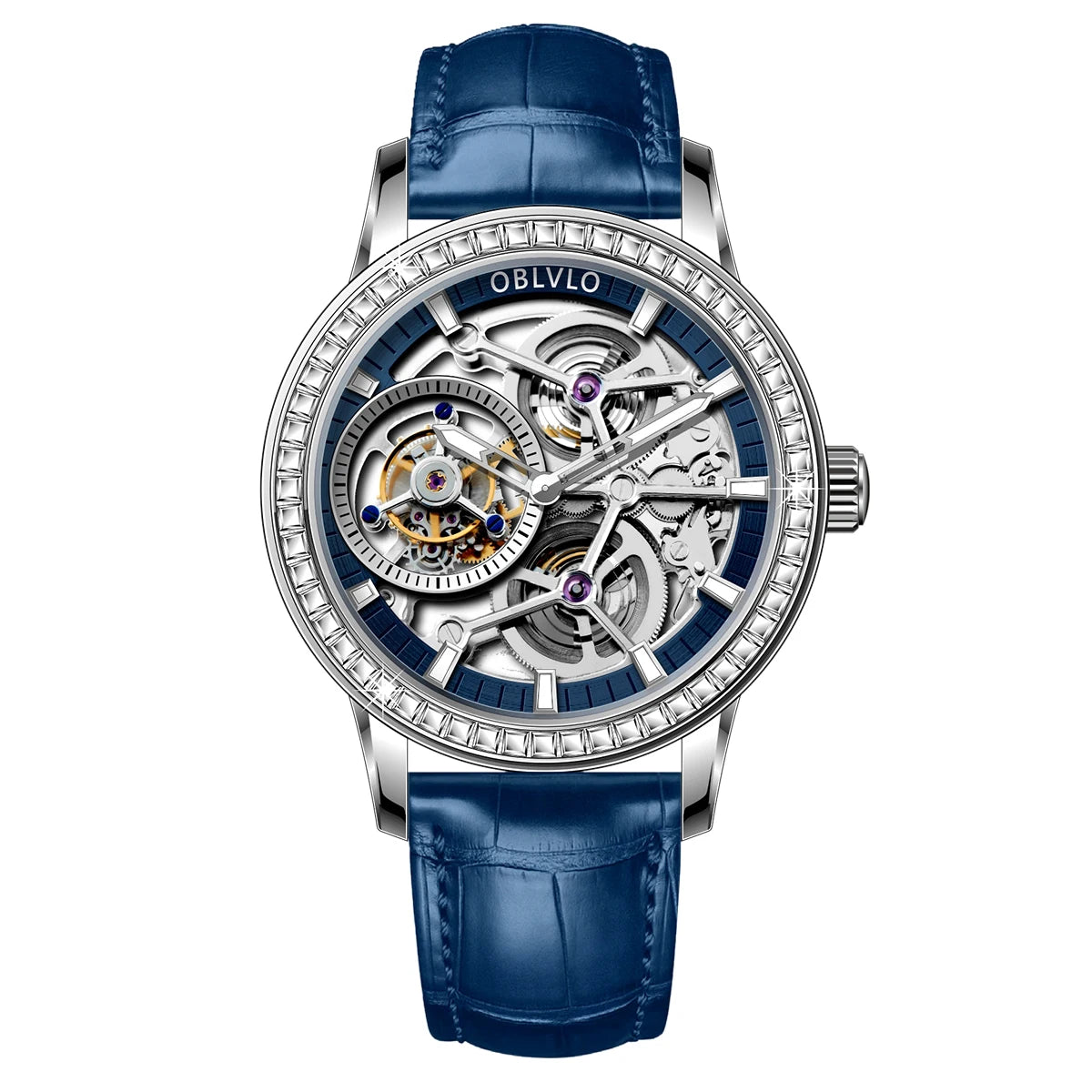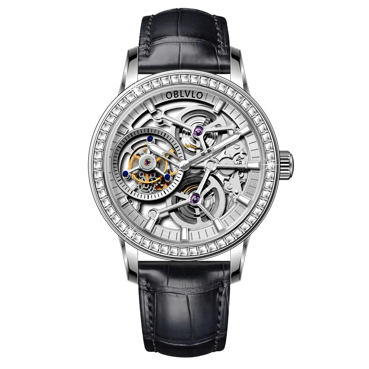 Schoensten Boutique Tourbillon Men's Mechanical Watches With Genuine Leather Diamond Bezel Steel Skeleton