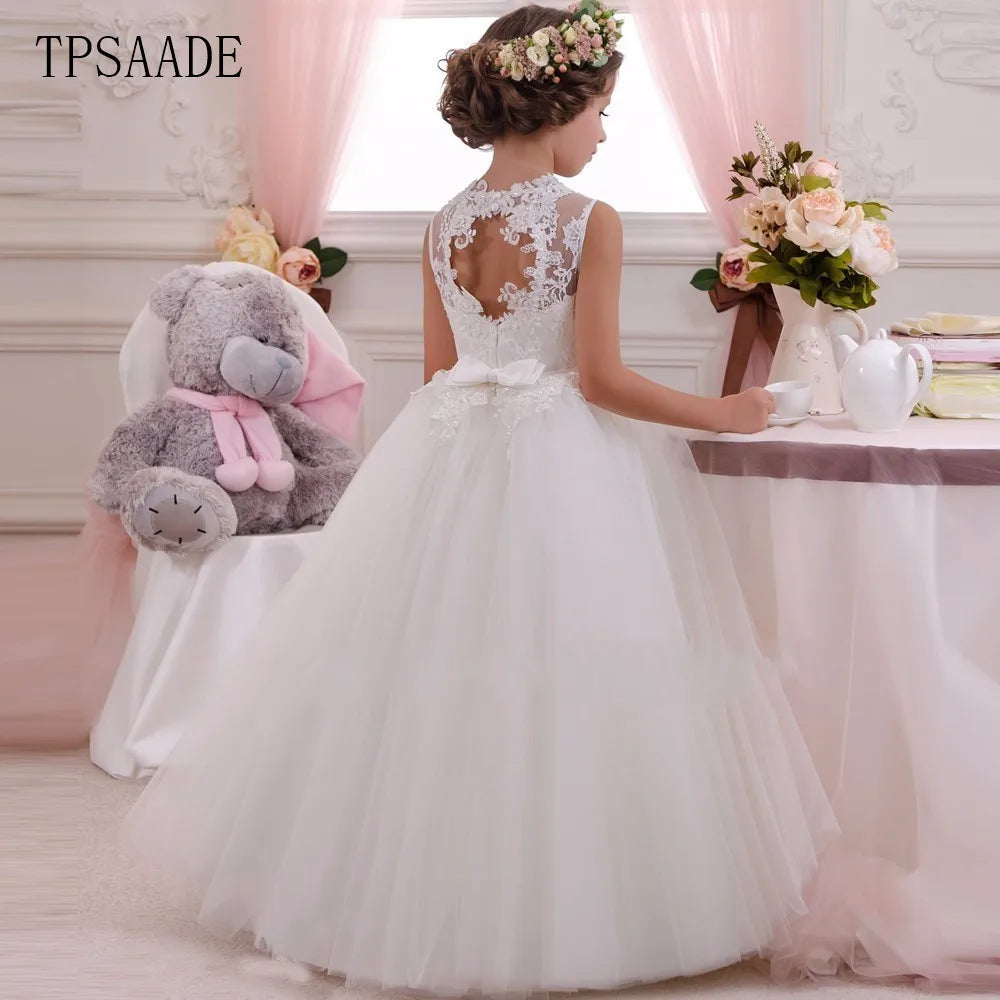 Schoensten Boutqiue Princess White Tulle Appliques Beaded Crystal Bow Belt Girl Dress