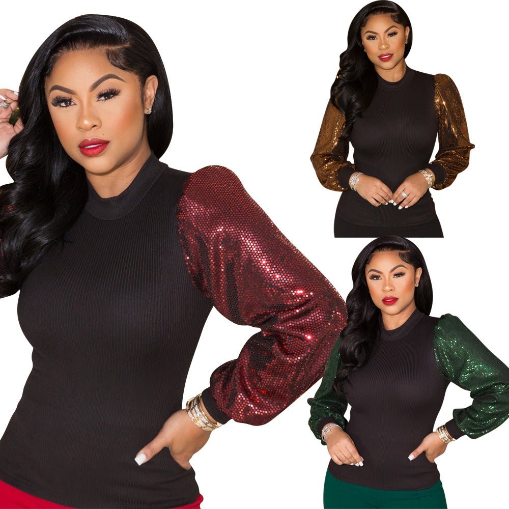 Sequins Puff Long Sleeve Patchwork Blouse